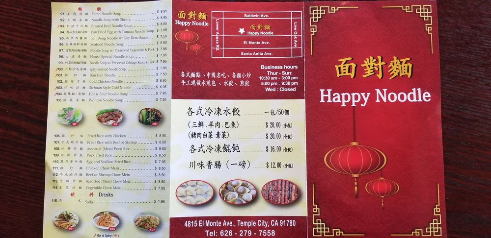 Happy Noodle, located in Temple City, CA, offers a range of Chinese noodle dishes with options for takeout, reservations, and catering. The restaurant provides a casual and quiet dining experience, suitable for groups and kids. The menu includes authentic and homemade handcrafted dishes, such as the chicken cold noodles, bean paste noodles, and pan-fried buns. Customers rave about the generous portions, flavorful broth, and reasonable prices. The cozy ambiance and quick service add to the overall dining experience. Whether you're craving spicy Dan Dan noodles or savory stir-fried fish fillet, Happy Noodle aims to delight your taste buds with their delicious offerings. With a mix of traditional flavors and warm hospitality, Happy Noodle stands out as a must-visit spot for Chinese cuisine lovers.